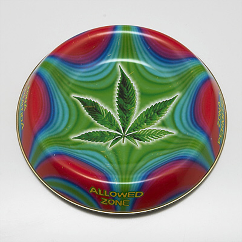 Simple metal ashtray with shape reminiscent of a dog bowl, hemp leaf motif and psycho pattern