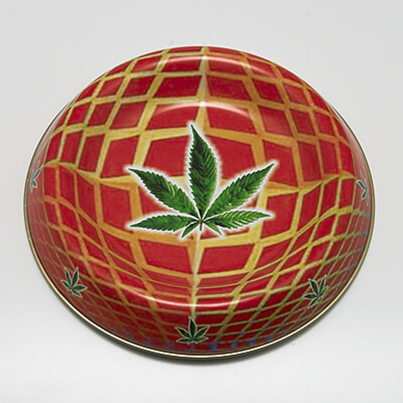 Simple metal ashtray with a shape reminiscent of a dog bowl, hemp leaf and spider web motif