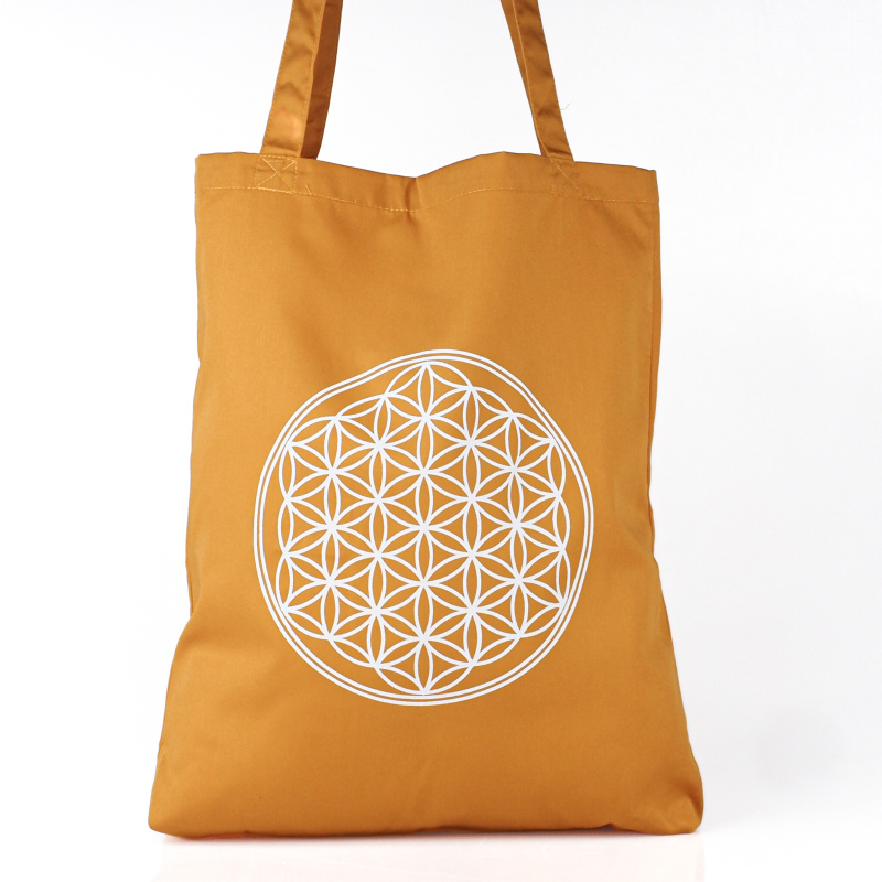 The bag is decorated with a beautiful print of the flower of life, making it a joyful accessory to carry every day.