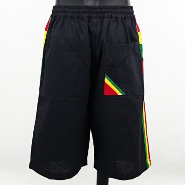 Black men's bermudas with black hemp leaf motif on rasta tricolour, decorated with rasta ribbon.