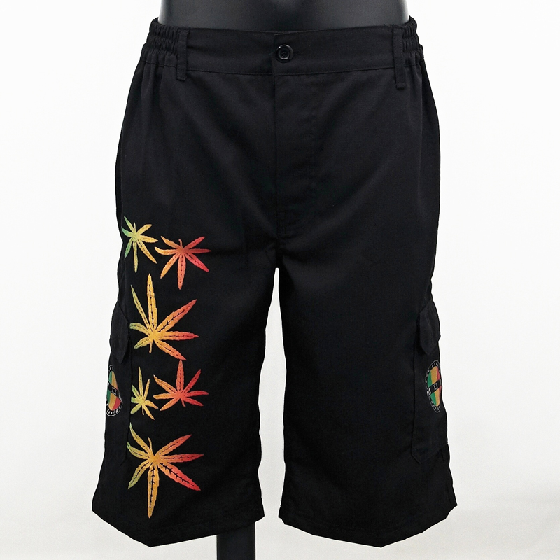Black men's bermudas with hemp leaf motifs and One Love logo in rasta colours.