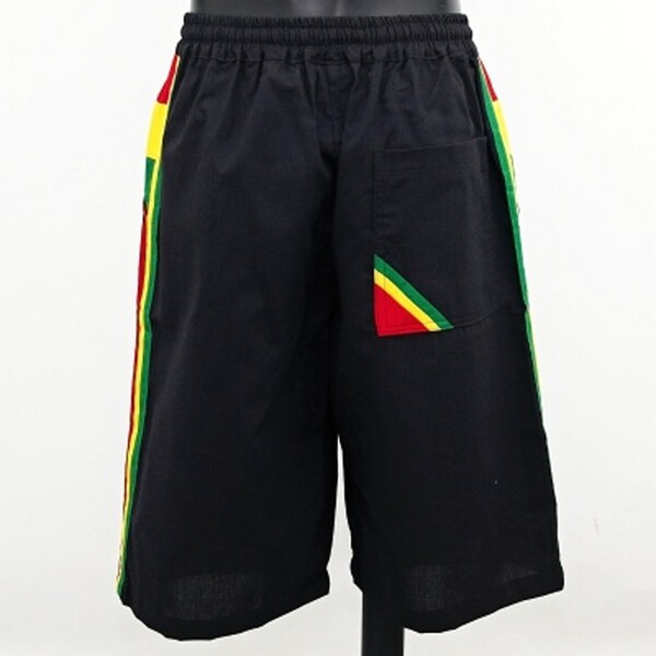 Black men's bermudas with Bob Marley singing motif on rasta applique, decorated with rasta ribbon.