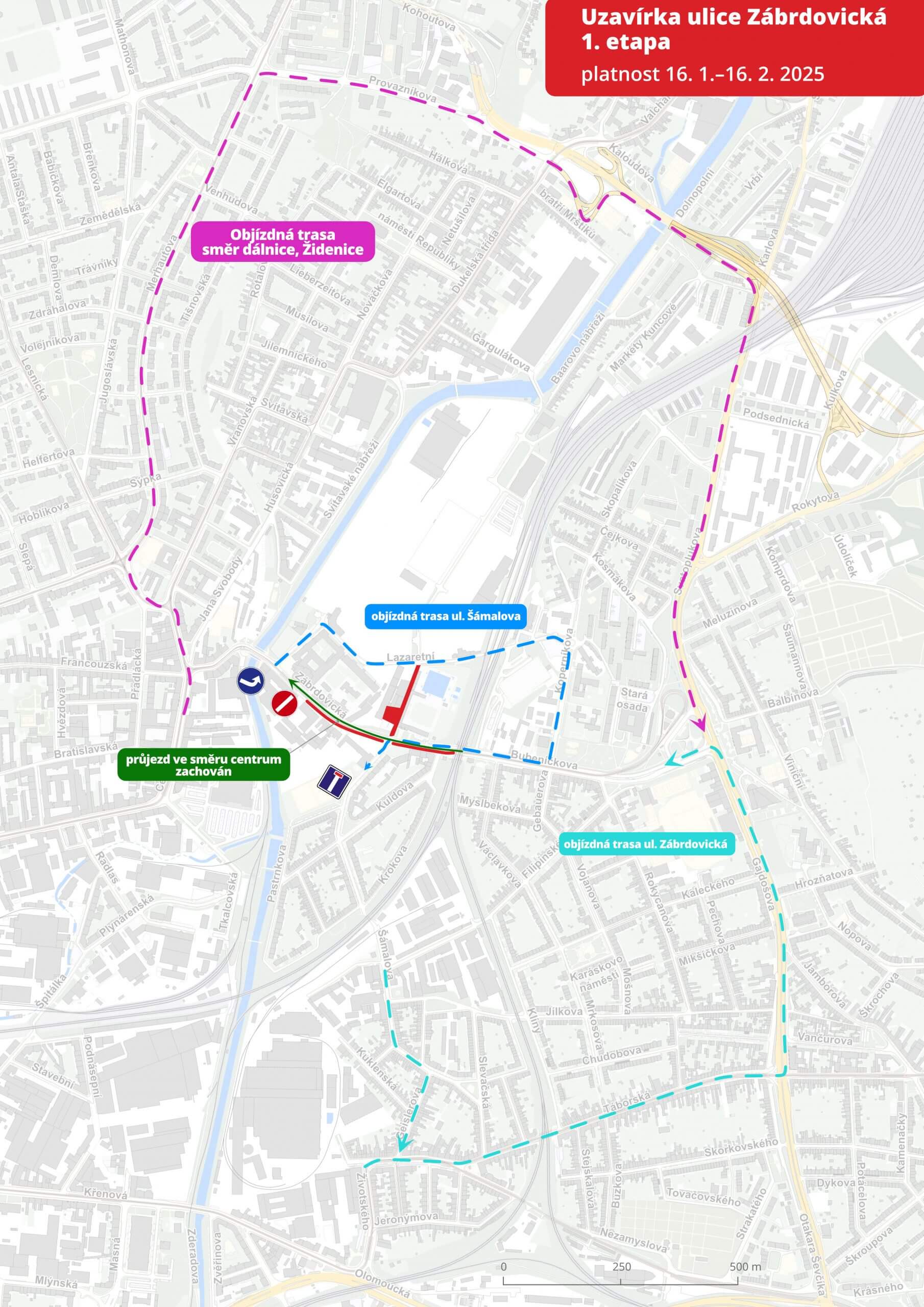 From January 16, 2025, there will be significant traffic restrictions on Zábrdovická Street in Brno due to the modification of the tram line between the Military Hospital (Vojenská nemocnice) and the railway bridge on Bubeníček Street. This first phase will last until February 16, 2025.