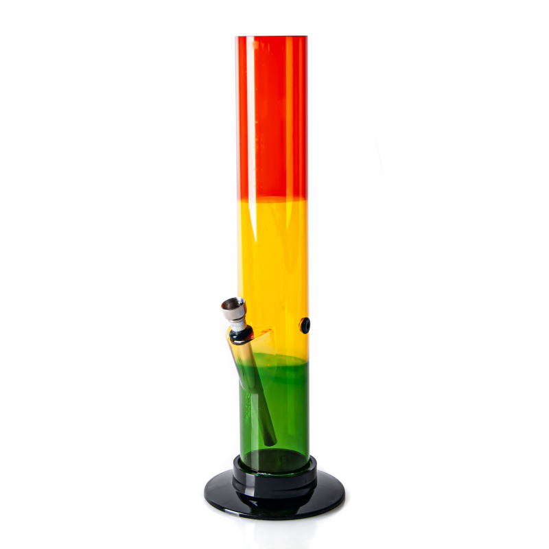 Smaller durable bong made of hardened plastic. The bong tube is made in traditional rasta colour combination