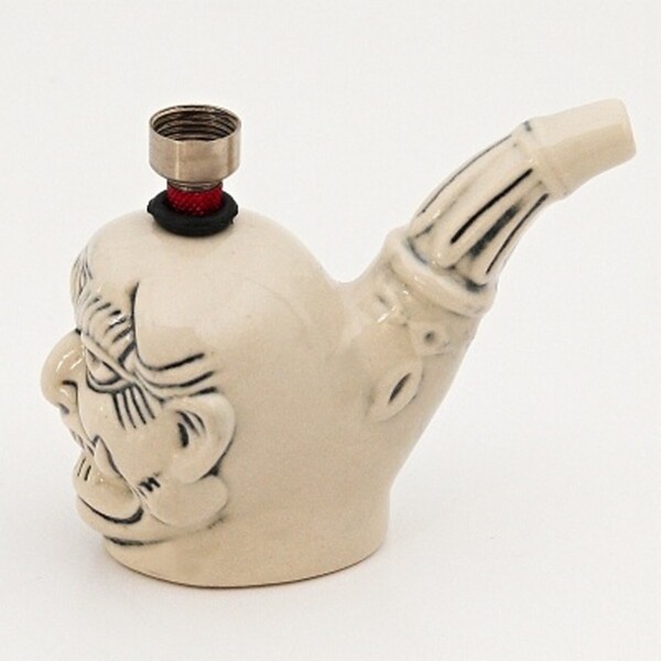 Smaller bong made of ceramic with a depiction of Lucifer's head with a sinister smile, with a turbo