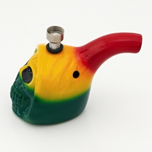 Small ceramic bong in skull shape in traditional rasta colour combination