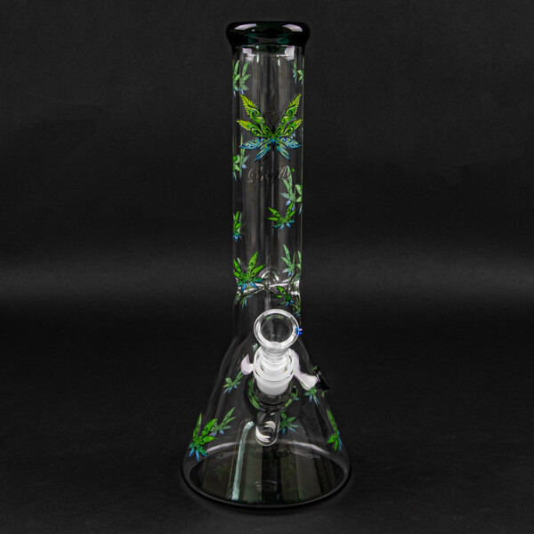 Medium size clear bong made of durable tempered glass Simax decorated with hemp leaf motif.