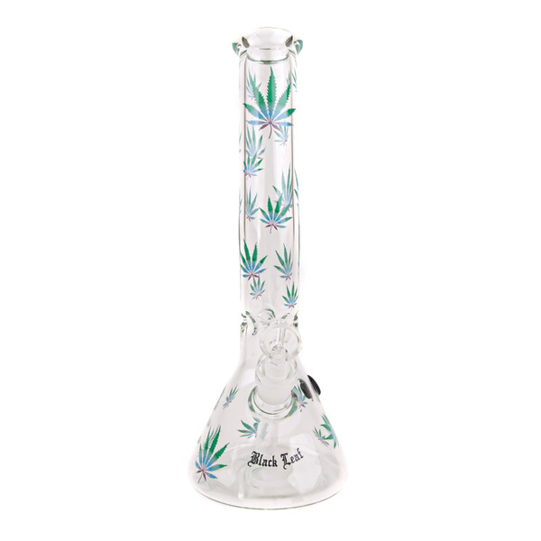 Medium size clear bong made of durable tempered glass Simax decorated with hemp leaf motif.