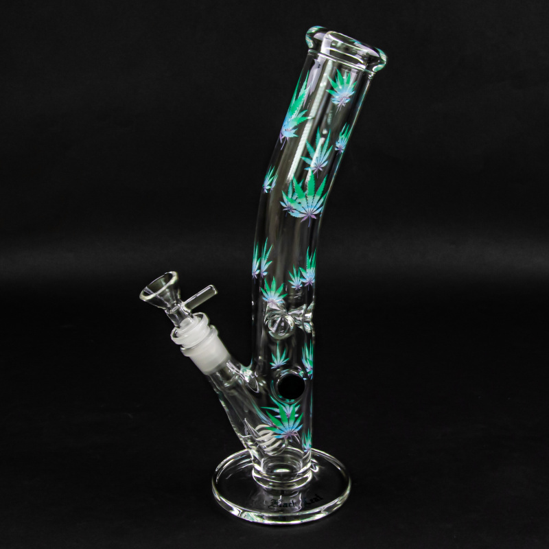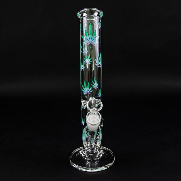 Medium size clear bong made of durable tempered glass Simax decorated with hemp leaf motif.