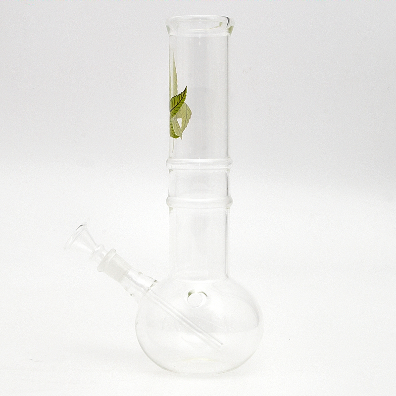 Excellent medium size Simax bong made of durable glass with round bulb and straight cylinder decorated with Cannaleaf motif