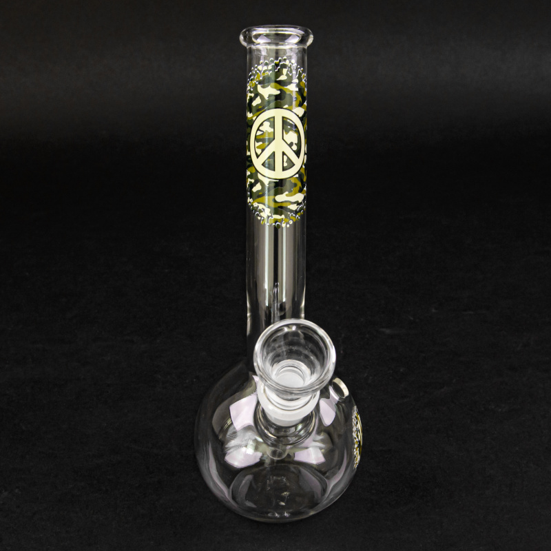 Smaller size clear bong made of durable tempered glass Simax decorated with Greenpiece logo motif.