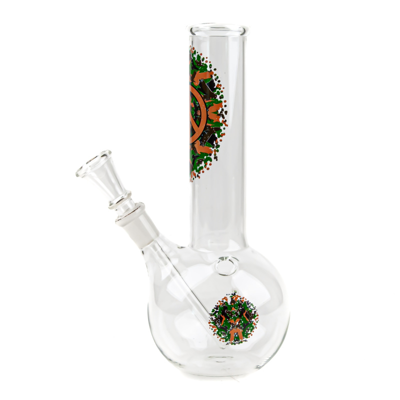 Smaller size clear bong made of durable tempered glass Simax decorated with Greenpiece logo motif.