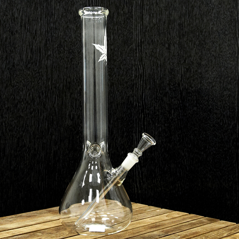 Medium size clear bong made of durable tempered glass Simax decorated with a single hemp leaf motif.