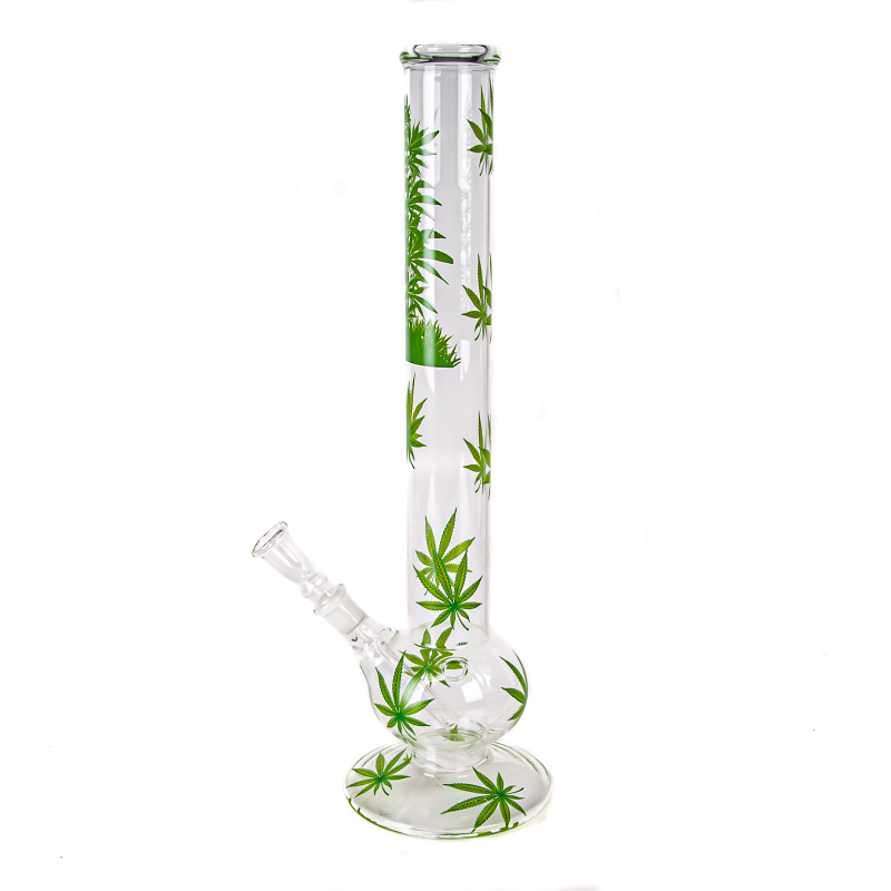 Medium size clear bong made of durable Simax tempered glass decorated with a single hemp leaf motif.