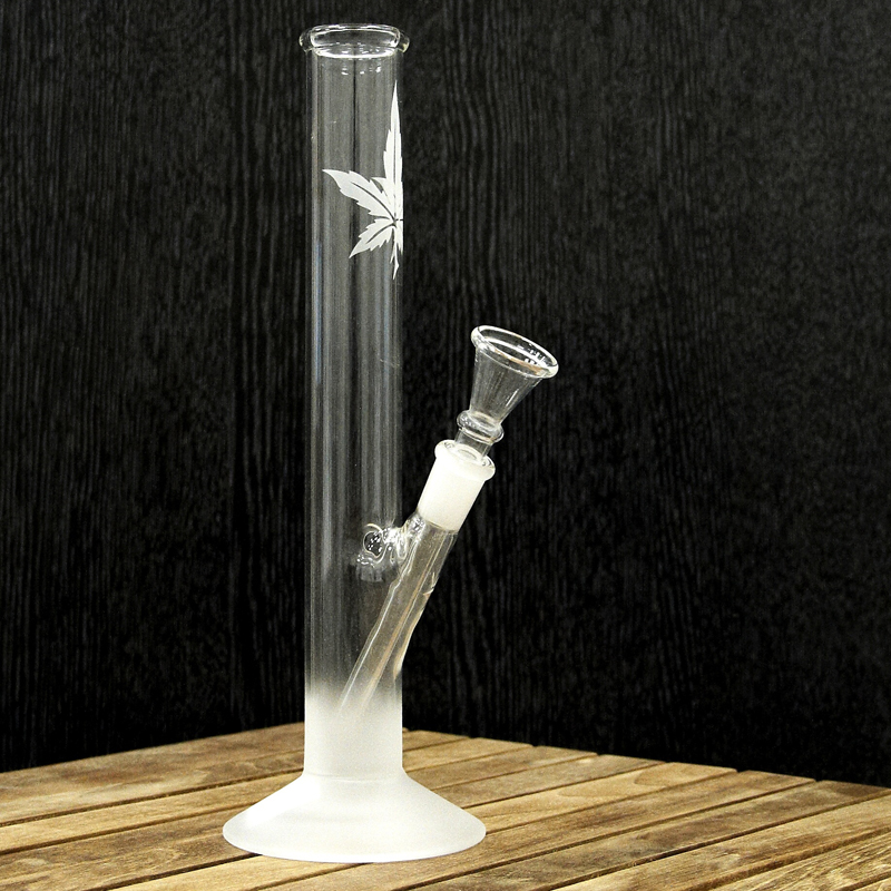 Clear Sand Leaf 26 cm bong made of durable tempered simax glass with sandblasted hemp leaf logo.