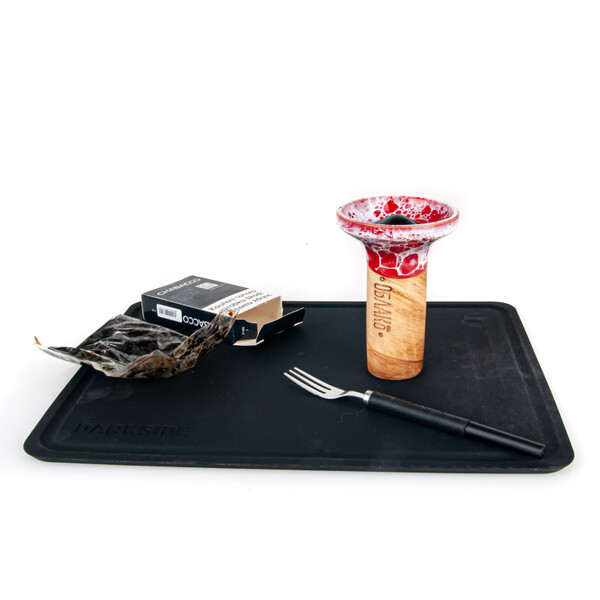 Charging a bowl is a "dirty business". Tobacco leaves fly off, and molasses drips and stains everything in its range. The Darkside tobacco pad easily solves this. Plus it keeps your bowl from sliding on smooth surfaces. The combination of plastic and silicone makes it easy to clean, and a stylish fork with a puncher will help you adjust the tobacco in the bowl to your liking.