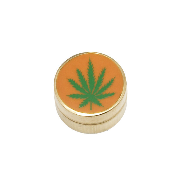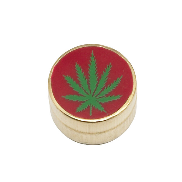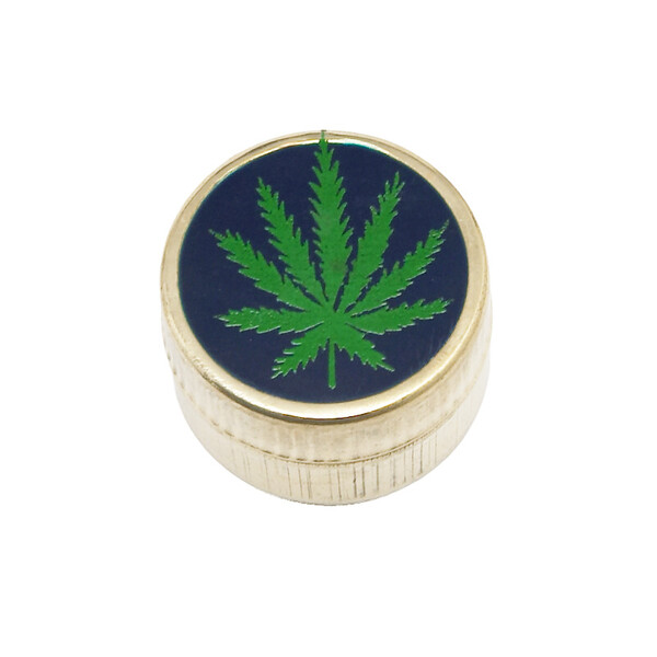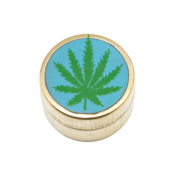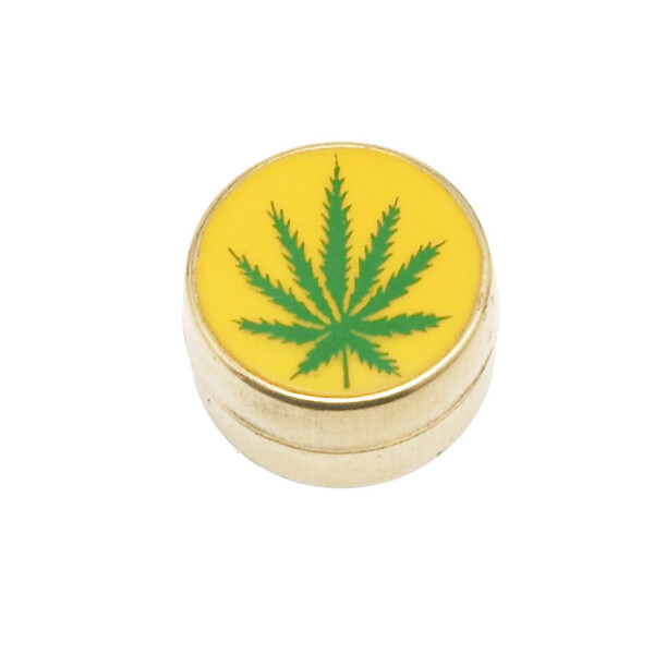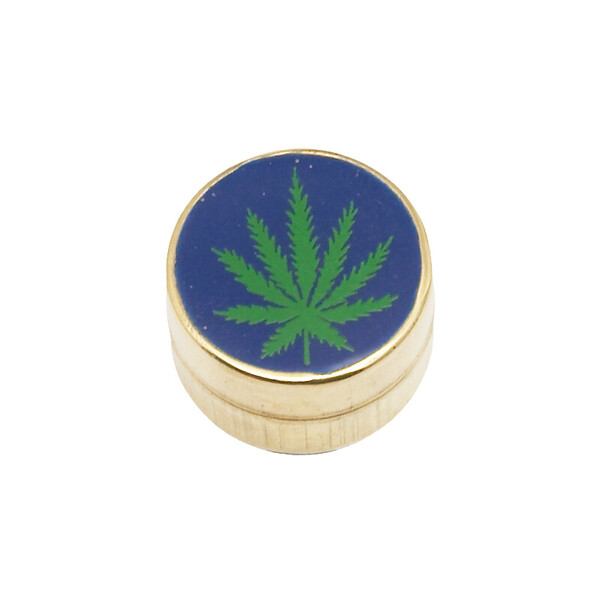 Small round box made of metal. Decorated with a small hemp leaf on the lid. There are several colour variants of these boxes in our offer.