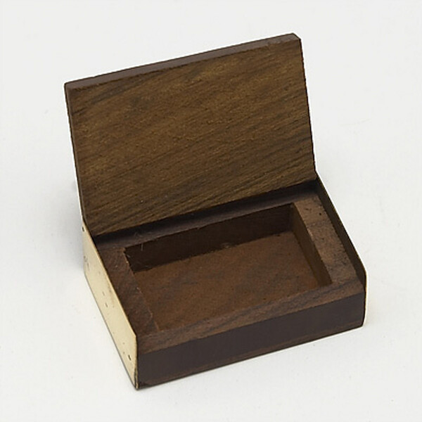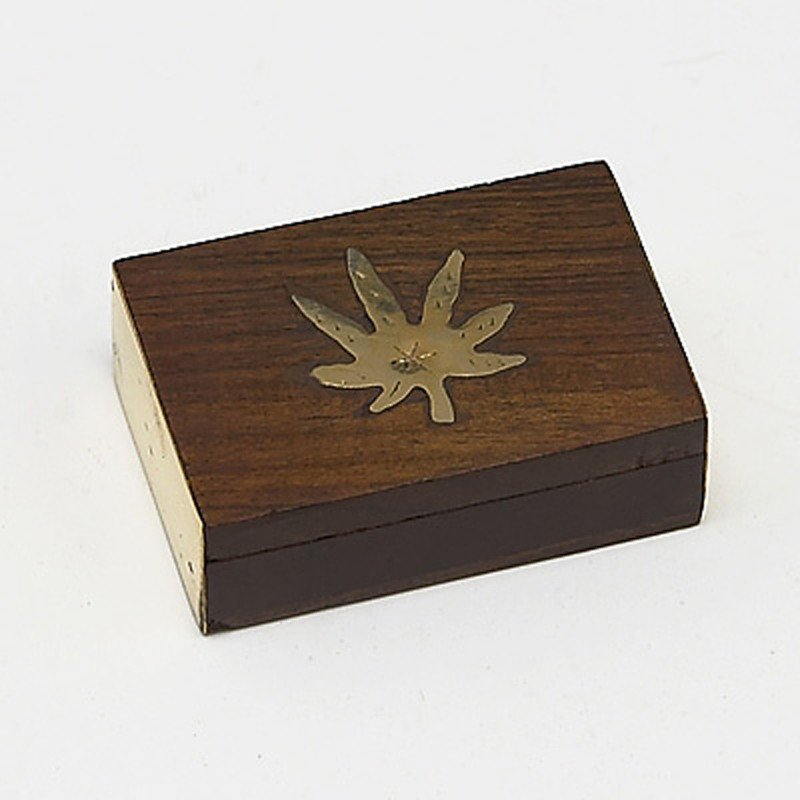 Small box made of wood decorated with a small metal leaf.