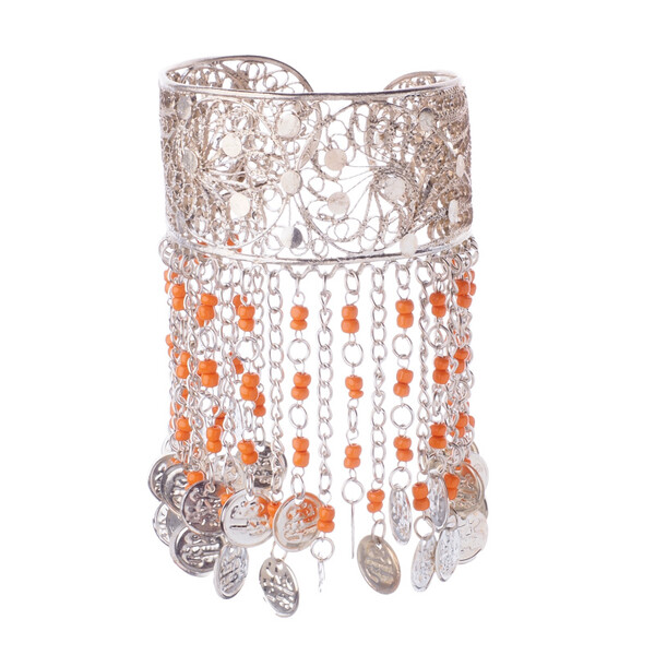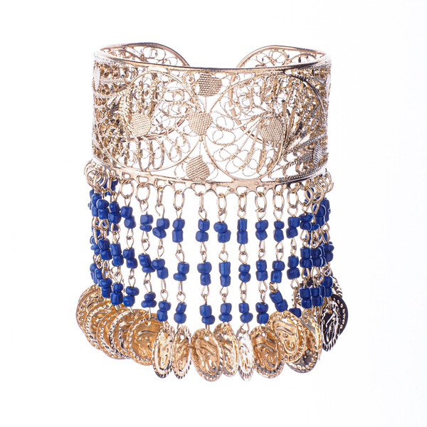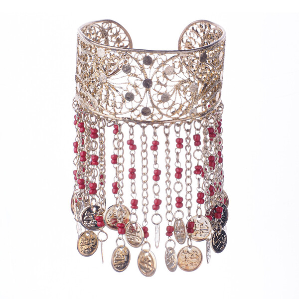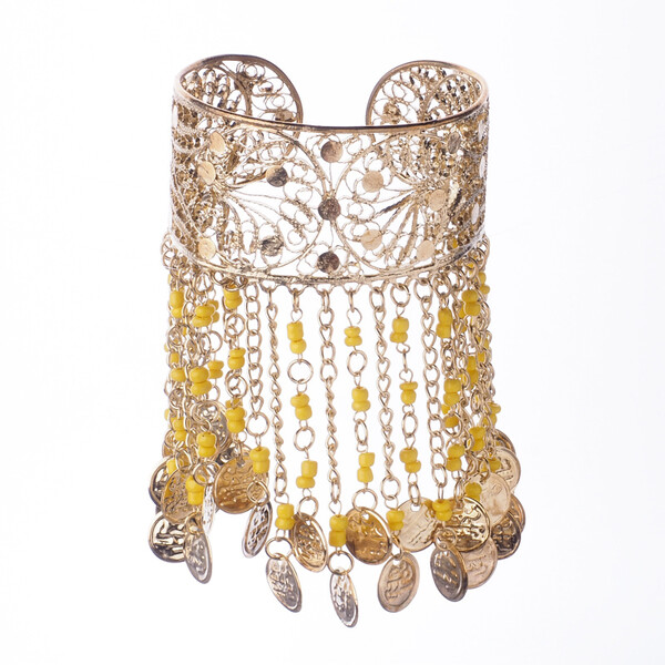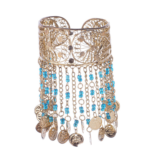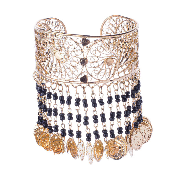 Beautiful solid Hasina belly dance bracelet, decorated with beads and pennies, adjustable size, gold
