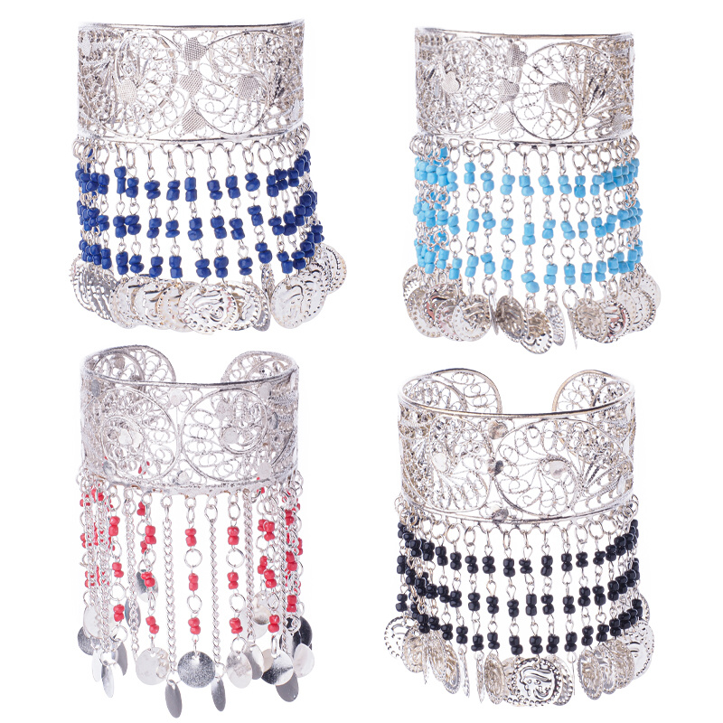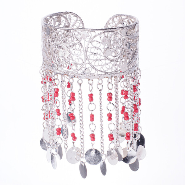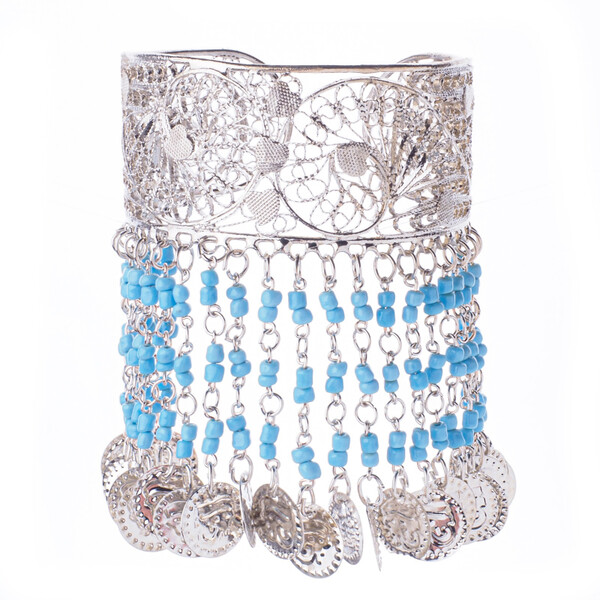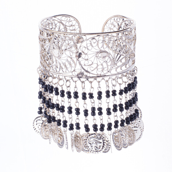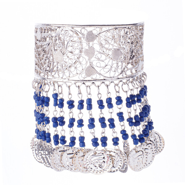 Beautiful solid Hasina belly dance bracelet, decorated with beads and pennies, adjustable size, silver