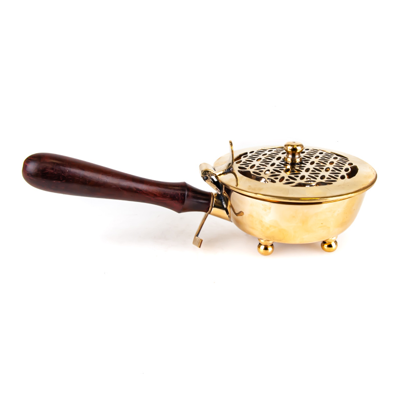 The censer with a wooden handle, designed for safe placement or convenient movement and transport, thanks to its sturdy and long handle. The lid features an embossed Flower of Life, offering its strength and protection to the incense in use.