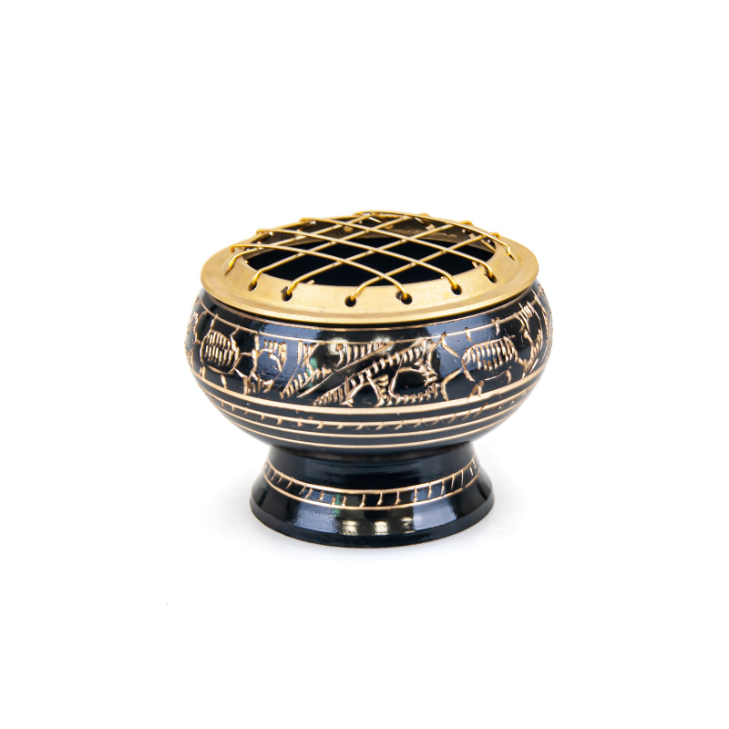 The metal censer in black and gold, with decorative ornaments, serves as not only a nice oriental decoration, but also a practical companion for every lover of incense sticks, cones, ropes, or powders and resins.