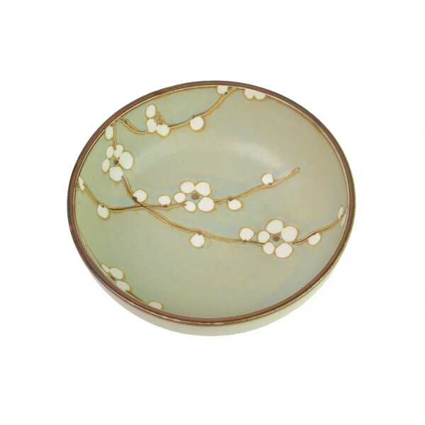 This unique artistic piece from the Far East combines the light green tones of the first leaves of spring with earthy brown details and impresses with a delicate motif of tiny white flowers. Thanks to the high-quality and health-safe materials used in its production, it serves not only as a decoration.