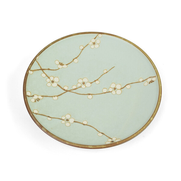 A charming plate with a motif of white sakura flowers in traditional Japanese style.