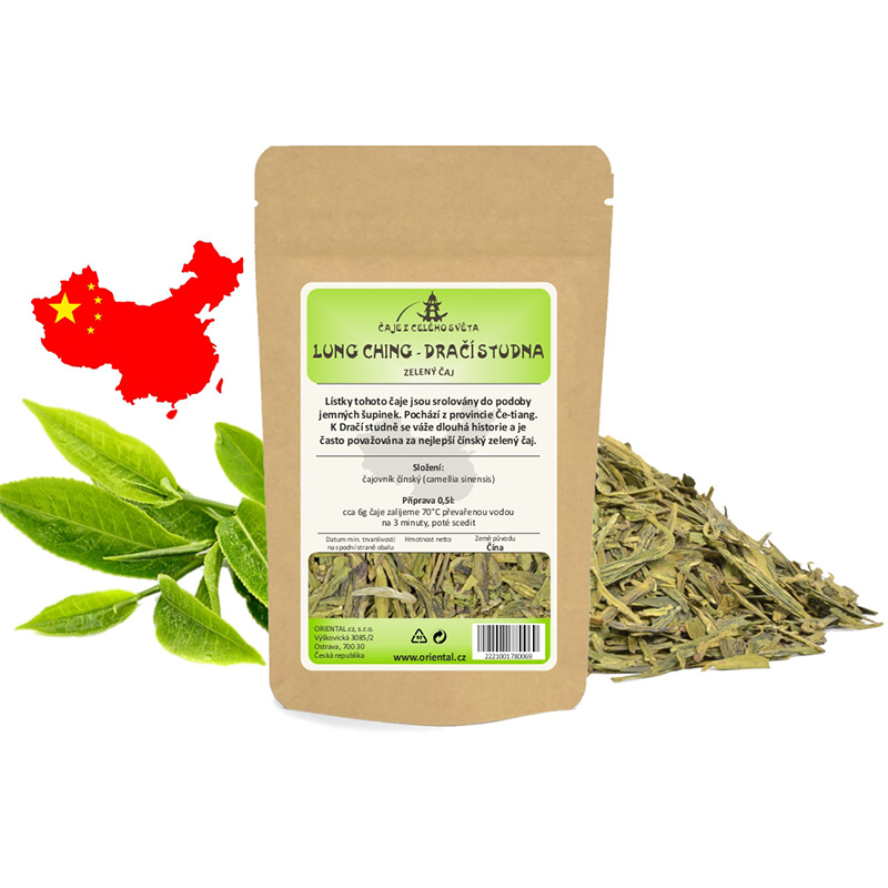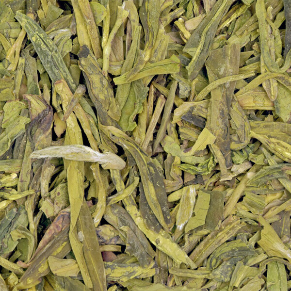 Chinese green tea genuine. It is grown in Zhejiang province in China. The light to dark green leaves are shaped into smooth and long scales. The tea infusion is greenish-yellow. Dragon's Well has a long history and many legends attached to it and is often considered the best Chinese tea.