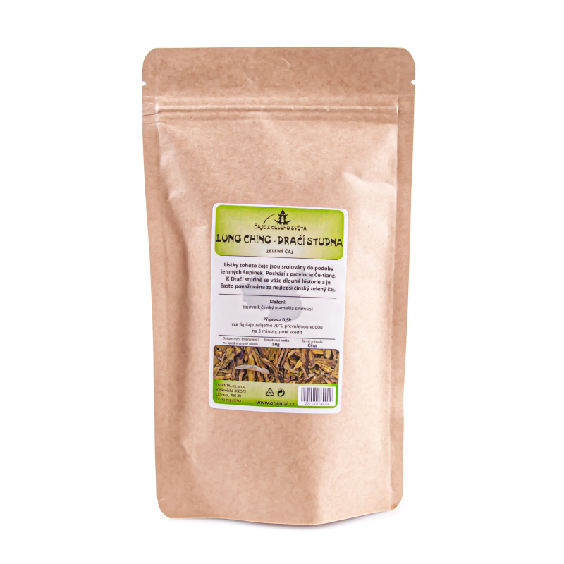 Chinese green tea genuine. It is grown in Zhejiang province in China. The light to dark green leaves are shaped into smooth and long scales. The tea infusion is greenish-yellow. There is a long history and many legends attached to Dragon's Well and it is often considered the best Chinese tea.