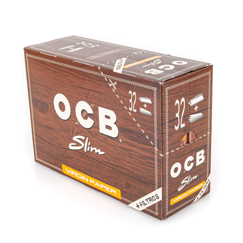 Brown, ultra-thin and unbleached OCB Virgin Slim KS papers with filters. The ultra-light and slightly porous papers deliver an even smoother smoking experience. The pack contains 32 booklets, with each booklet containing 32 "sheets" of OCB papers.
