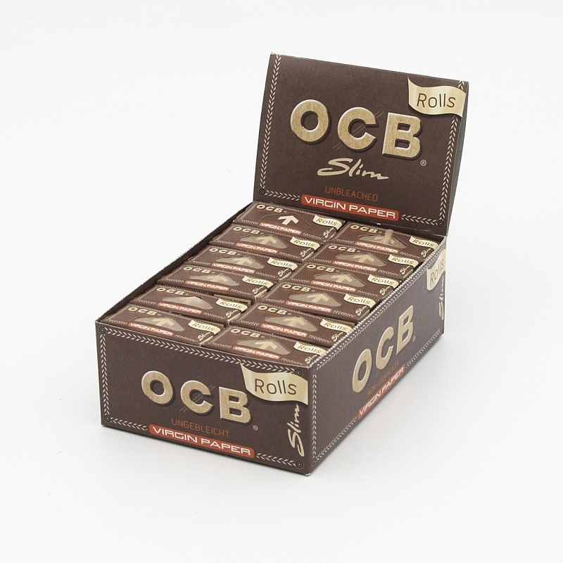 The OCB Virgin Slim Rolls Cigarette Paper is one infinitely long rice paper rolled into a roll from which you can tear a paper of any length. OCB Virgin Slim Rolls cigarette paper has a natural adhesive and is characterised by its slow burn. The pack contains 24 rolls