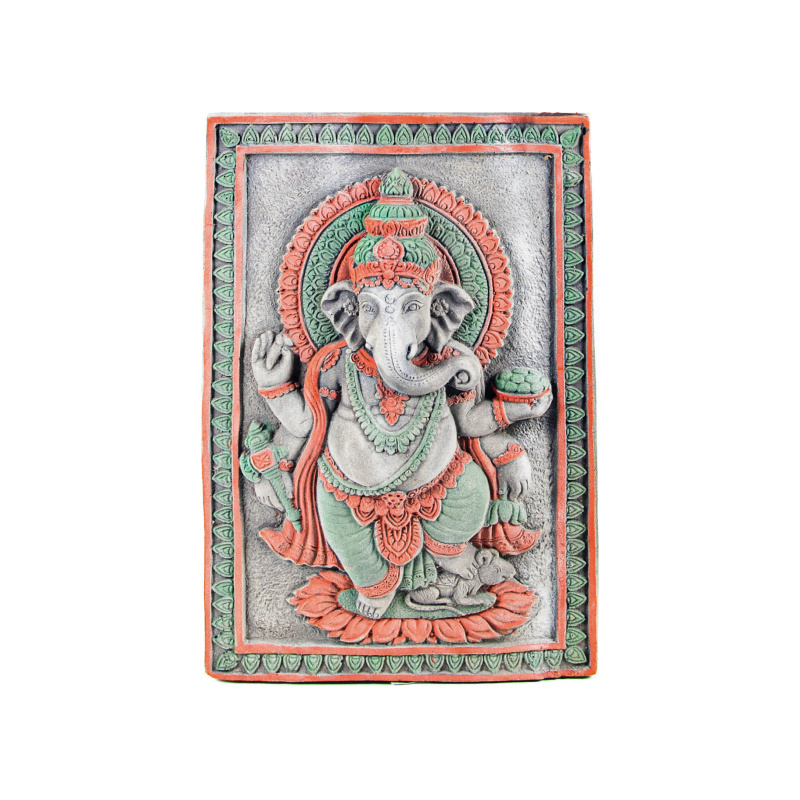 Decoration like a Thai temple. A huge concrete slab with detailed carvings of the Hindu god Ganesha turns any place into a shrine.