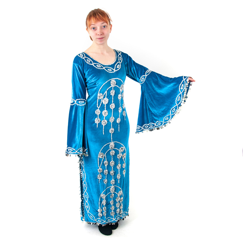 Egyptian dress made of stretch velvet with bell sleeves (bell width is approx. 55cm), decorated opening in the armpit area and slits, is designed for dancing or serves as a formal wear. As it is a stretchy material, all the measurements given in the circumference are rather approximate, the material can be stretched by about 5cm - 10cm.
