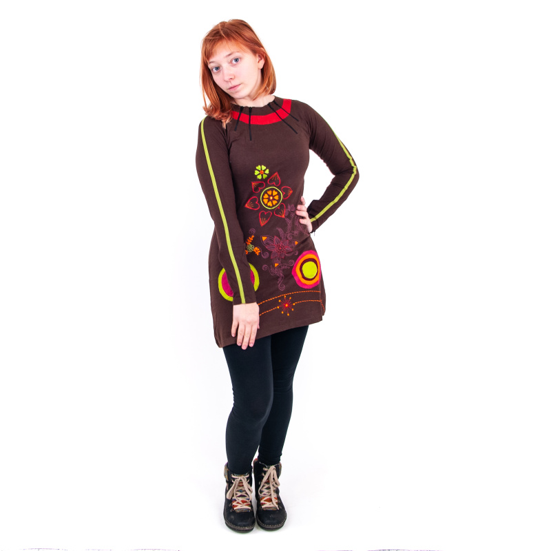 Nepalese dress with floral motifs and long sleeves Joy 17 in brown, size M