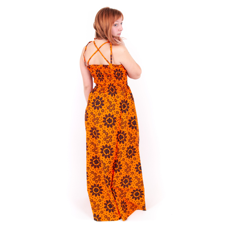 Devi long dress full of flowers, froggy bodice, tie straps, size L, orange
