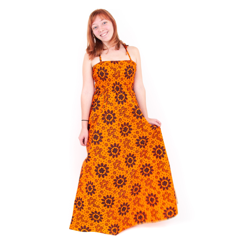 Devi long dress full of flowers, froggy bodice, tie straps, size XL, orange