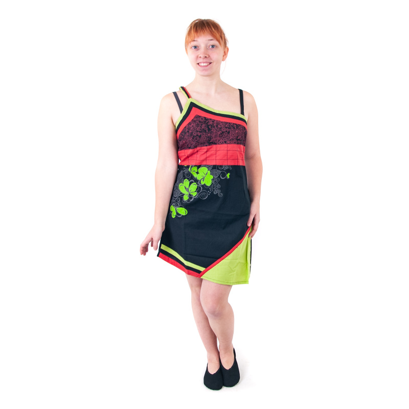 Airy cotton short dress with asymmetric cut Sanjana, decorated with floral motifs, size XL, black red green
