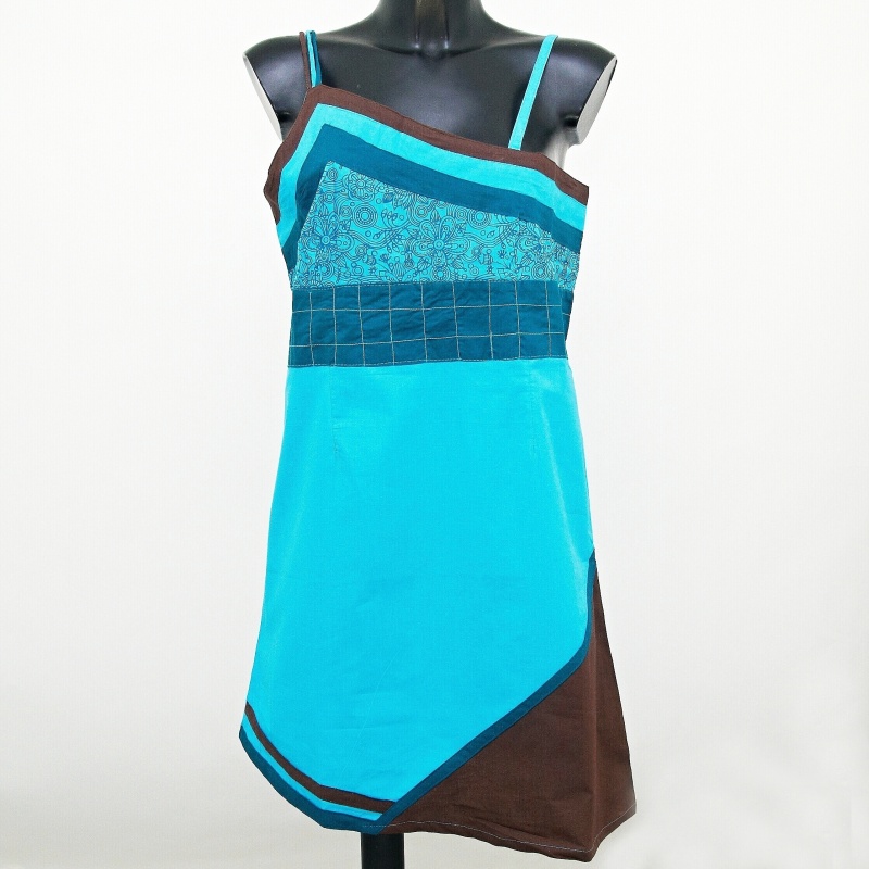 Interestingly asymmetrically cut and decorated short dress Sanjana, thin straps, size XL, turquoise brown