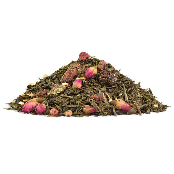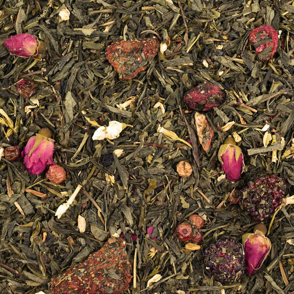Ingredients: Sencha and China Jasmin green tea with flowers, raisins (raisins, sunflower oil), flavouring, rose buds, strawberries, jasmine (1.1%), blackberries (0.7%), raspberries, redcurrants, blueberries.