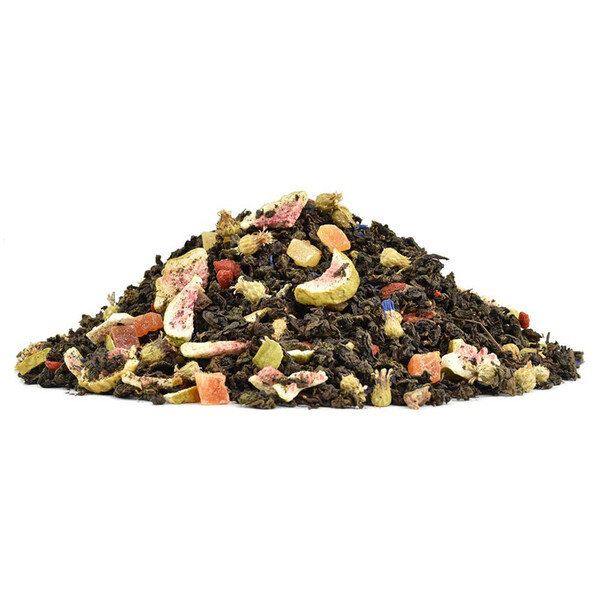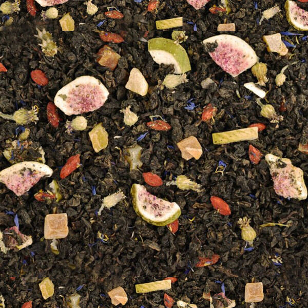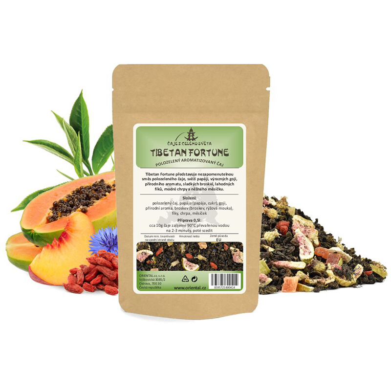 Tibetan Fortune is an enchanting blend of semi-green tea, lush papaya, juicy goji, natural aromas, sweet peaches, delicious figs, blue cornflower and delicate calendula. This harmonious combination delivers not only a rich taste experience but also a visual delight that combines the exotic freshness of the tropics with the mystical atmosphere of the Tibetan heights. Discover new flavours and aromas with every sip of Tibetan Fortune.