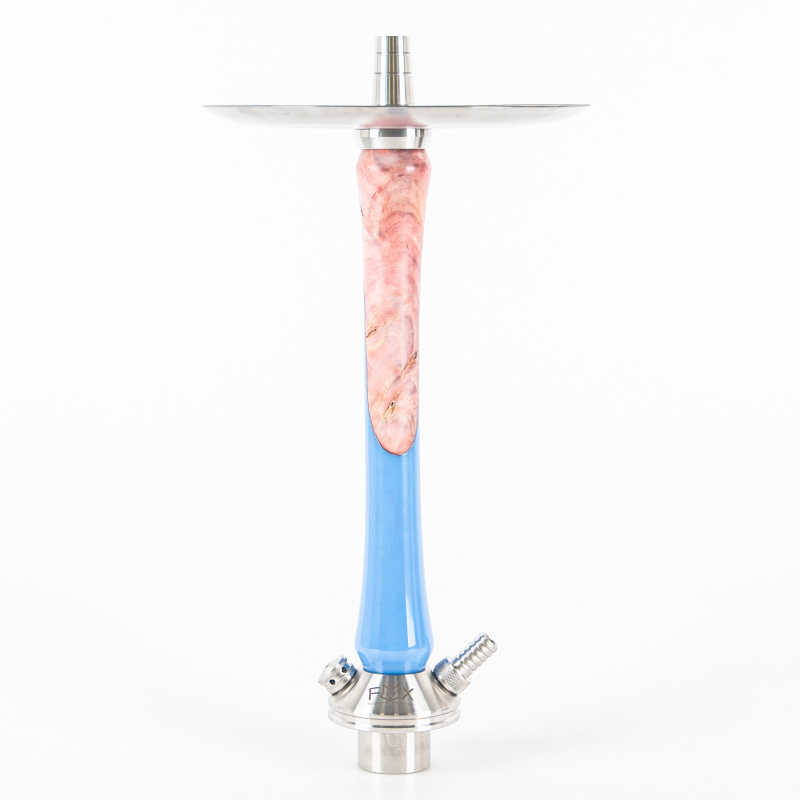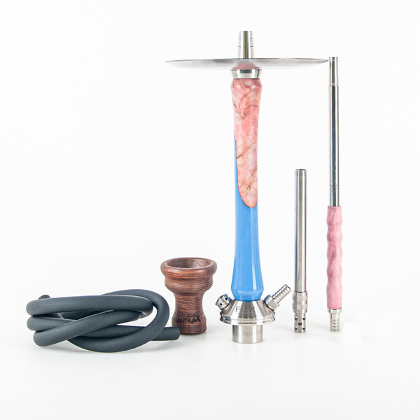 The Wood 2.0 Hybrid hookah from the Russian brand FOX is based on the Wood 2.0 model, which has a stainless steel stem that is covered by a removable wooden sleeve. The label Hybrid refers to the sleeve, which combines different types of wood and acrylate resin. The sleeves are all handmade, and so the decorations make each piece completely unique.