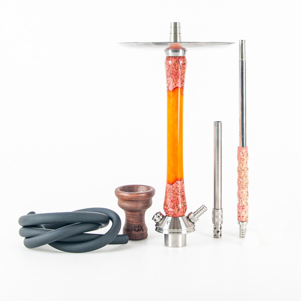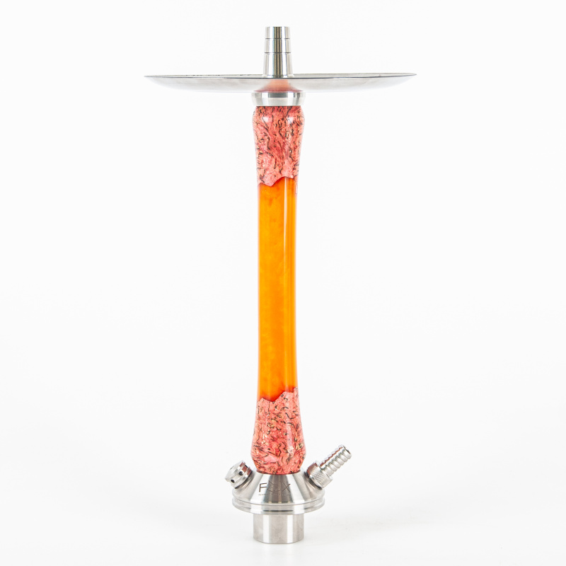 The Wood 2.0 Hybrid hookah from the Russian brand FOX is based on the Wood 2.0 model, which has a stainless steel stem that is covered by a removable wooden sleeve. The label Hybrid refers to the sleeve, which combines different types of wood and acrylate resin. The sleeves are all handmade, and so the decorations make each piece completely unique.