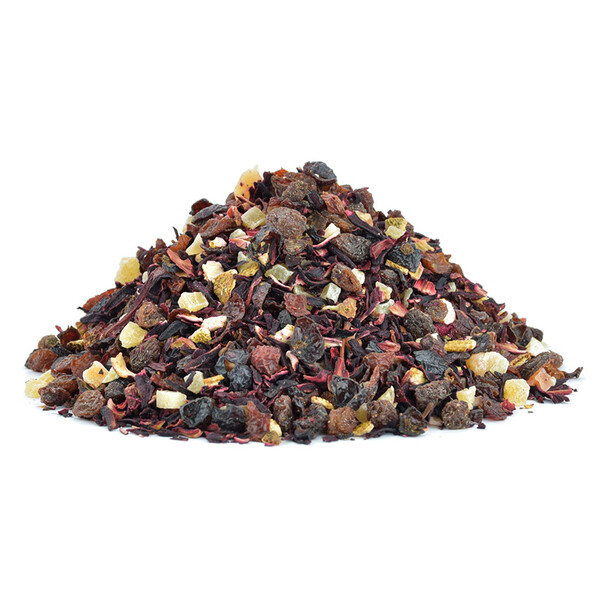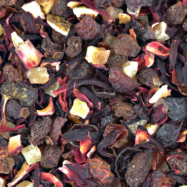Ingredients: rosehip, hibiscus flowers, grape, candied pineapple, mango, papaya, lemon. A quality fruit blend with no added colourings or preservatives.