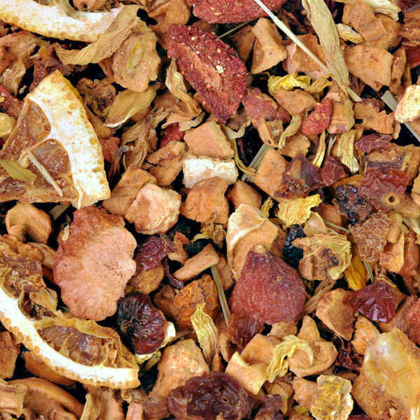 And these ingredients make up the tea: apple pieces, citrus peel, strawberry pieces, lemongrass, sunflower petals, citric acid, natural flavor.