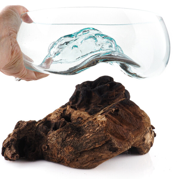 Each piece is a true original and genuine work of art. The molten glass is shaped directly onto a specific piece of wood, allowing it to conform perfectly to the unique curves of the root. The bowl is removable for easy cleaning yet remains securely stable.