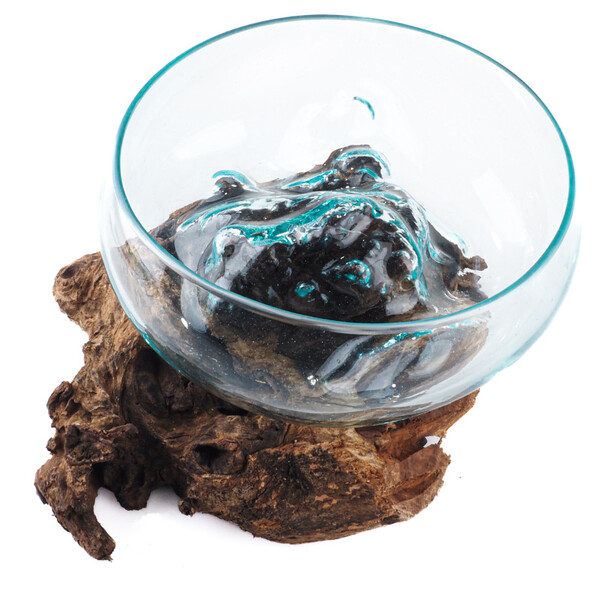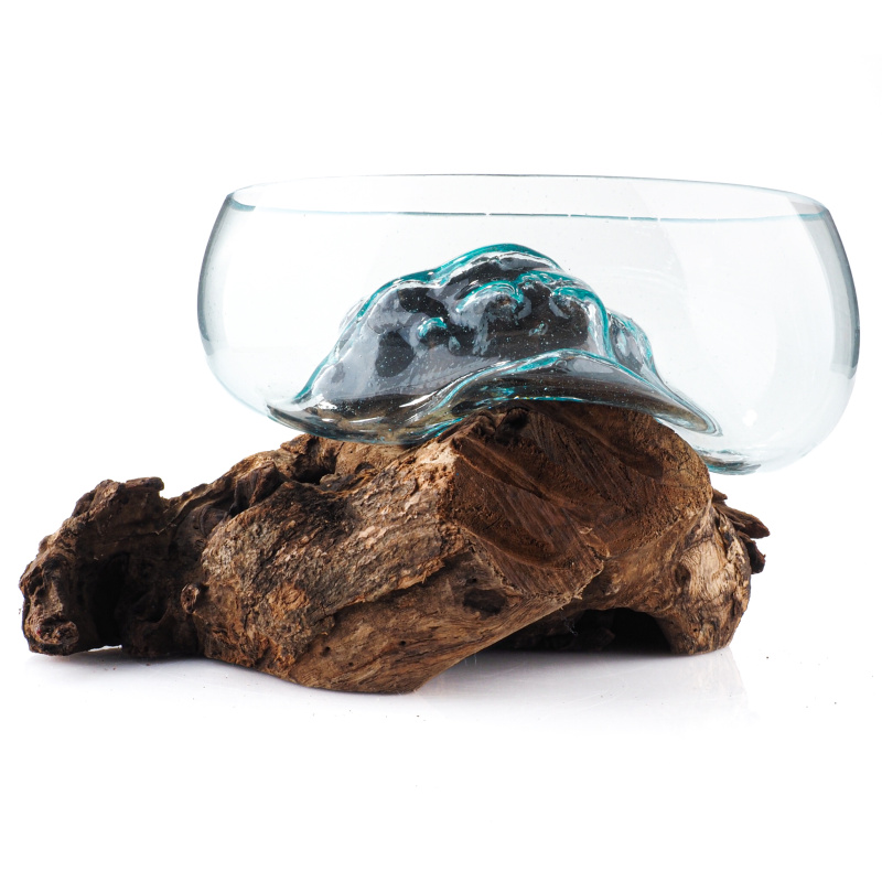 An extraordinary fusion of nature and human creativity in the form of a glass bowl set in an unfinished piece of wood, that comes from the exotic island of Bali, where it is handcrafted by local artists.