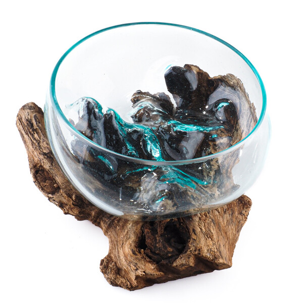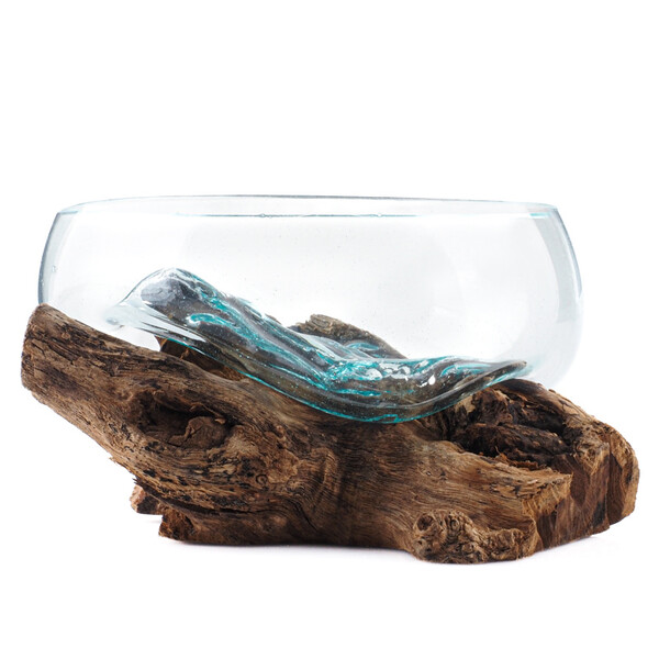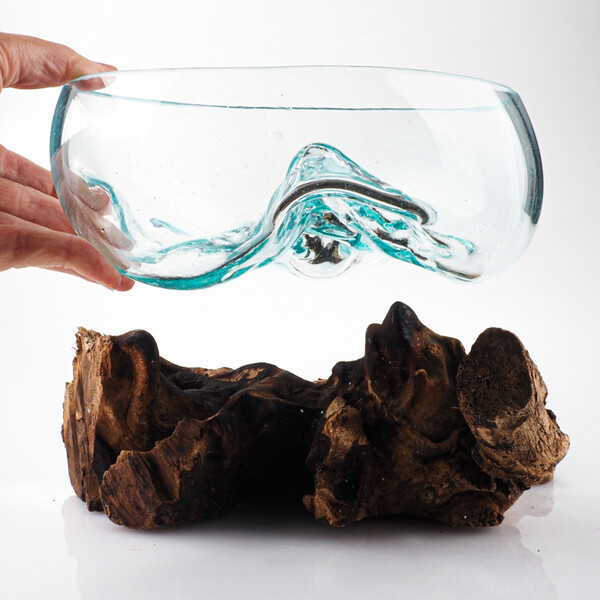 An extraordinary fusion of nature and human creativity in the form of a glass bowl set in an unfinished piece of wood, that comes from the exotic island of Bali, where it is handcrafted by local artists.