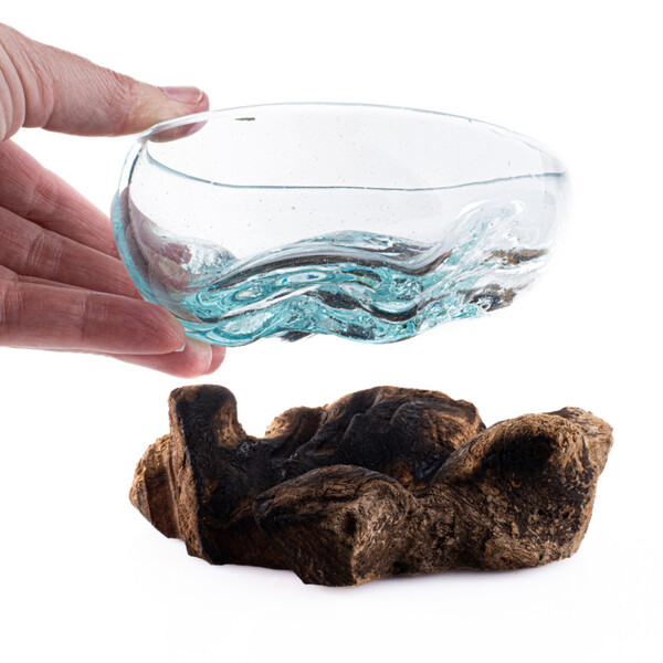 An extraordinary fusion of nature and human creativity in the form of a small glass bowl set in an unfinished piece of wood, that comes from the exotic island of Bali, where it is handcrafted by local artists.