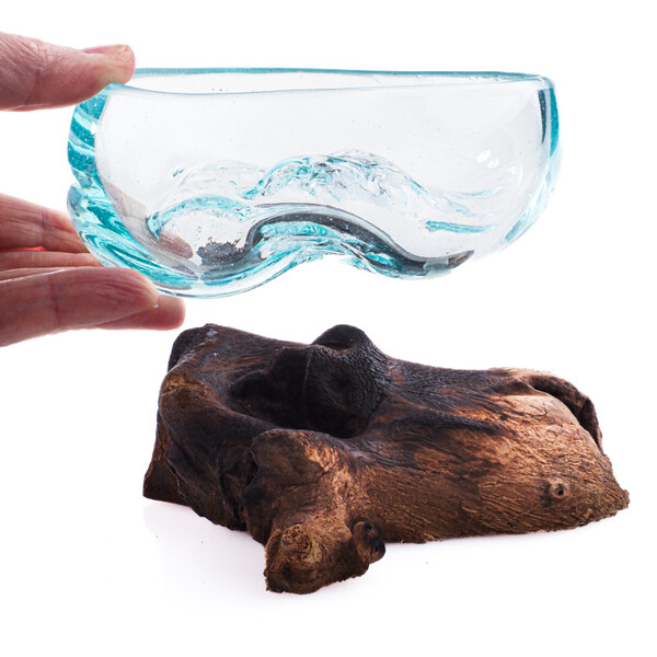 Each piece is a true original and genuine work of art. The molten glass is shaped directly onto a specific piece of wood, allowing it to conform perfectly to the unique curves of the root. The small bowl is removable for easy cleaning yet remains securely stable.